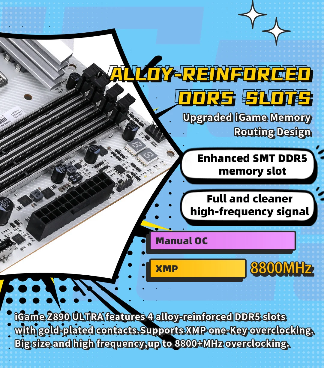 iGame Z890 ULTRA, altın kaplama kontaklara sahip alaşımla güçlendirilmiş 4 DDR5 yuvasına sahiptir. XMP tek tuşla hız aşırtmayı destekler. Büyük boyut ve yüksek frekans, 8800+MHz'e kadar hız aşırtma desteği sağlar.